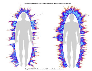 Fotos Kirlianas do campo bioenergético de um atleta realizadas (Abril 2011) antes e depois de ser submetido a uma sessão de cura reconectiva.